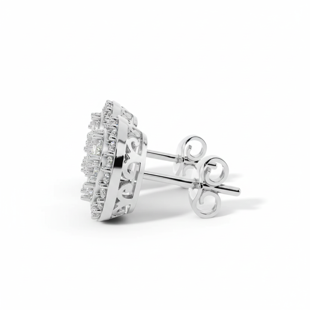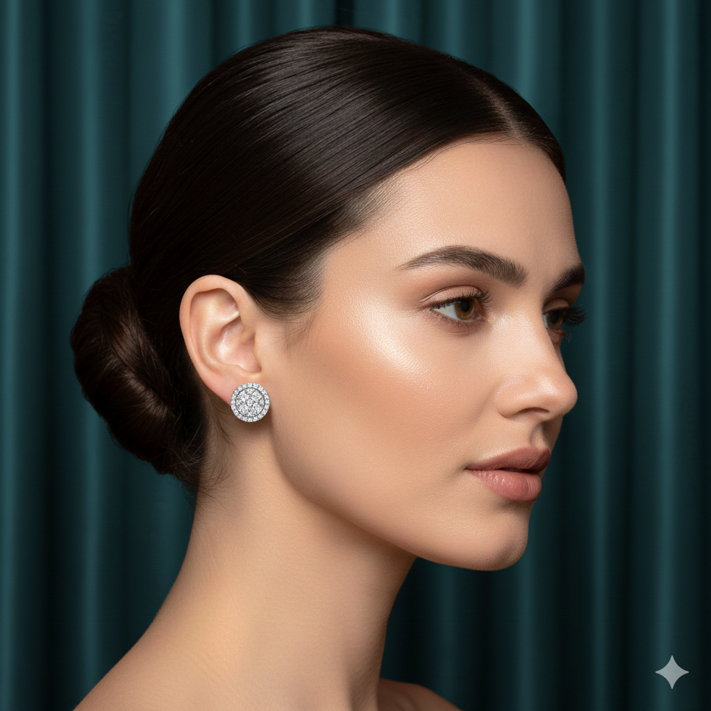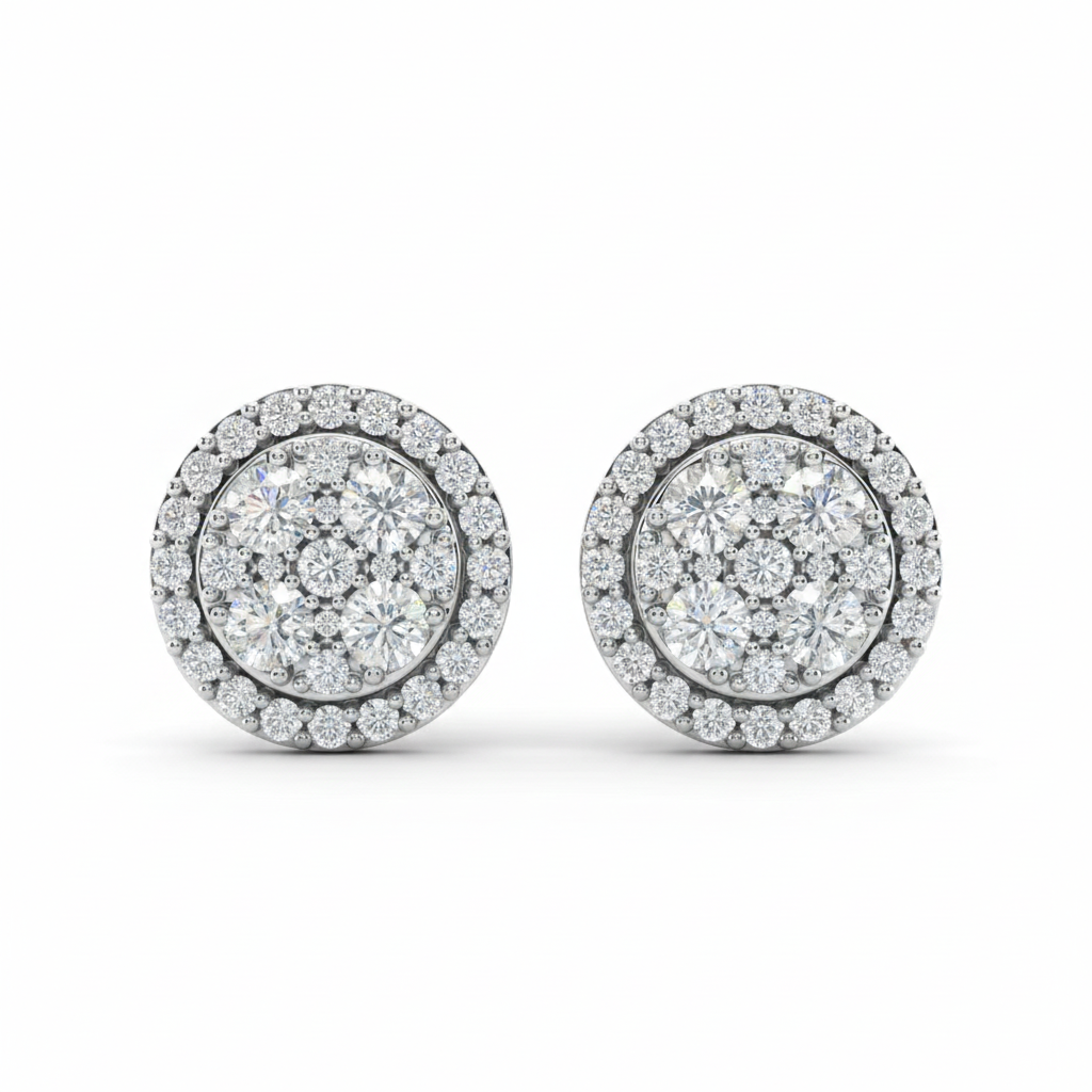 These round halo studs feature a brilliant pavé center, encircled by a gherī of sparkling stones. The radiant border enhances their brilliance, creating a timeless design that embodies sophistication, elegance, and lasting beauty.