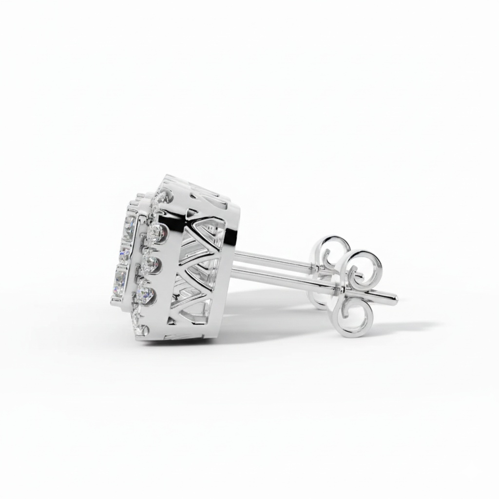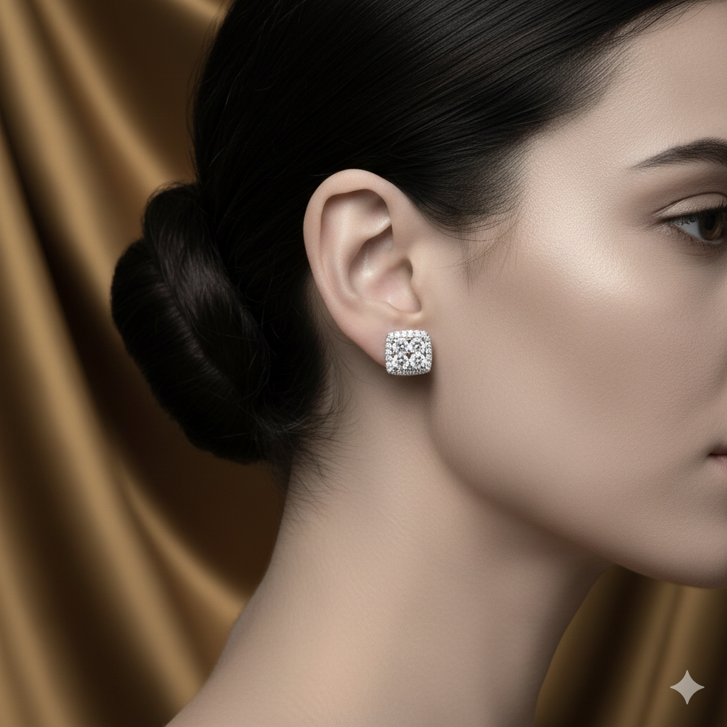 These square studs feature softened edges, dual prong settings, and a gherī of sparkling stones. Meticulously crafted, they combine modern elegance with radiant brilliance, making them a versatile and eye-catching accessory for any occasion.