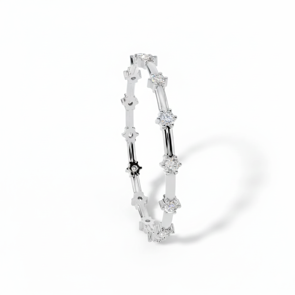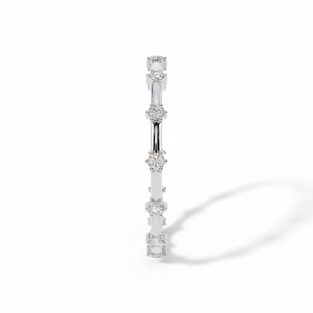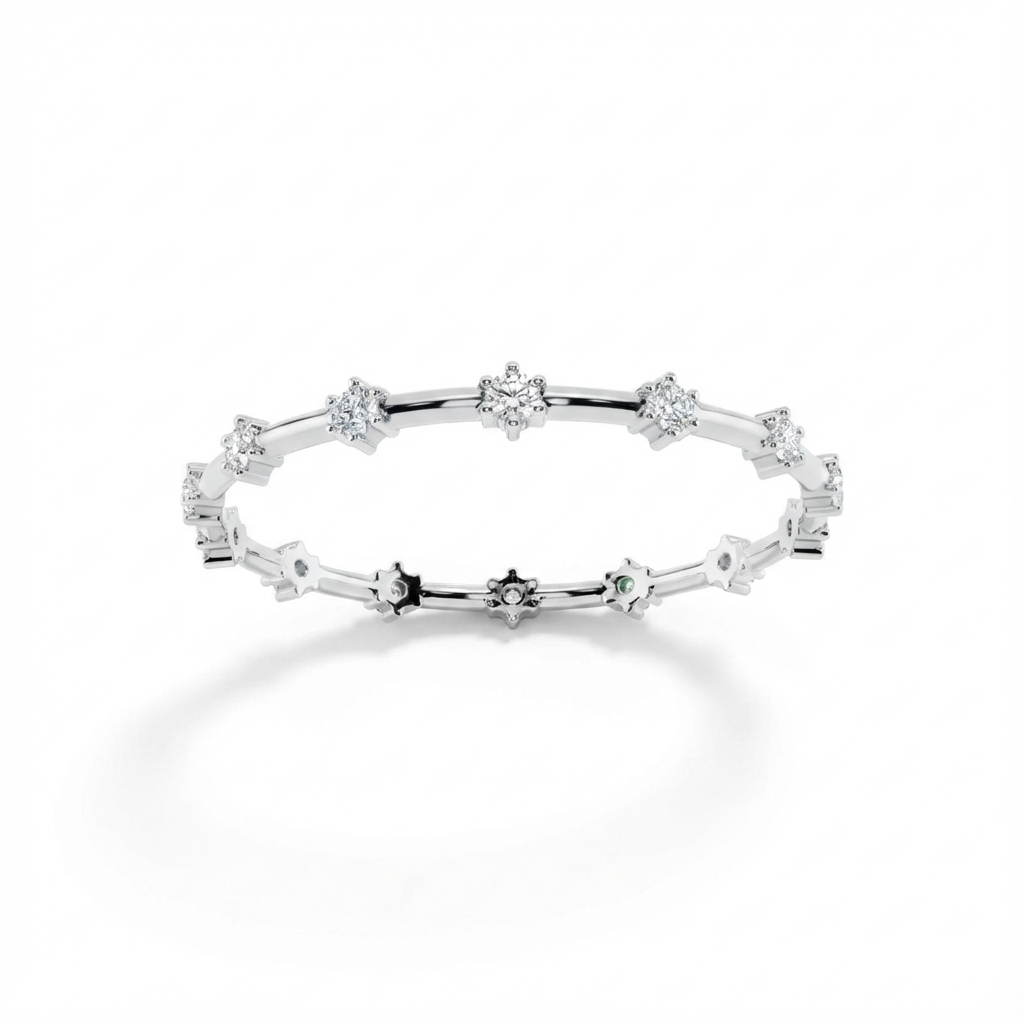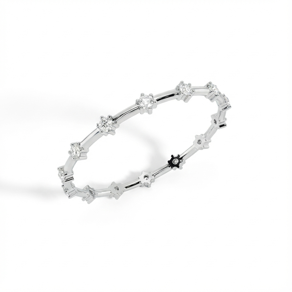 A delicate, white-gold finished band featuring dainty floral-inspired diamond stations for a timeless, ethereal look. Perfect for stacking or as a minimalist standalone piece.