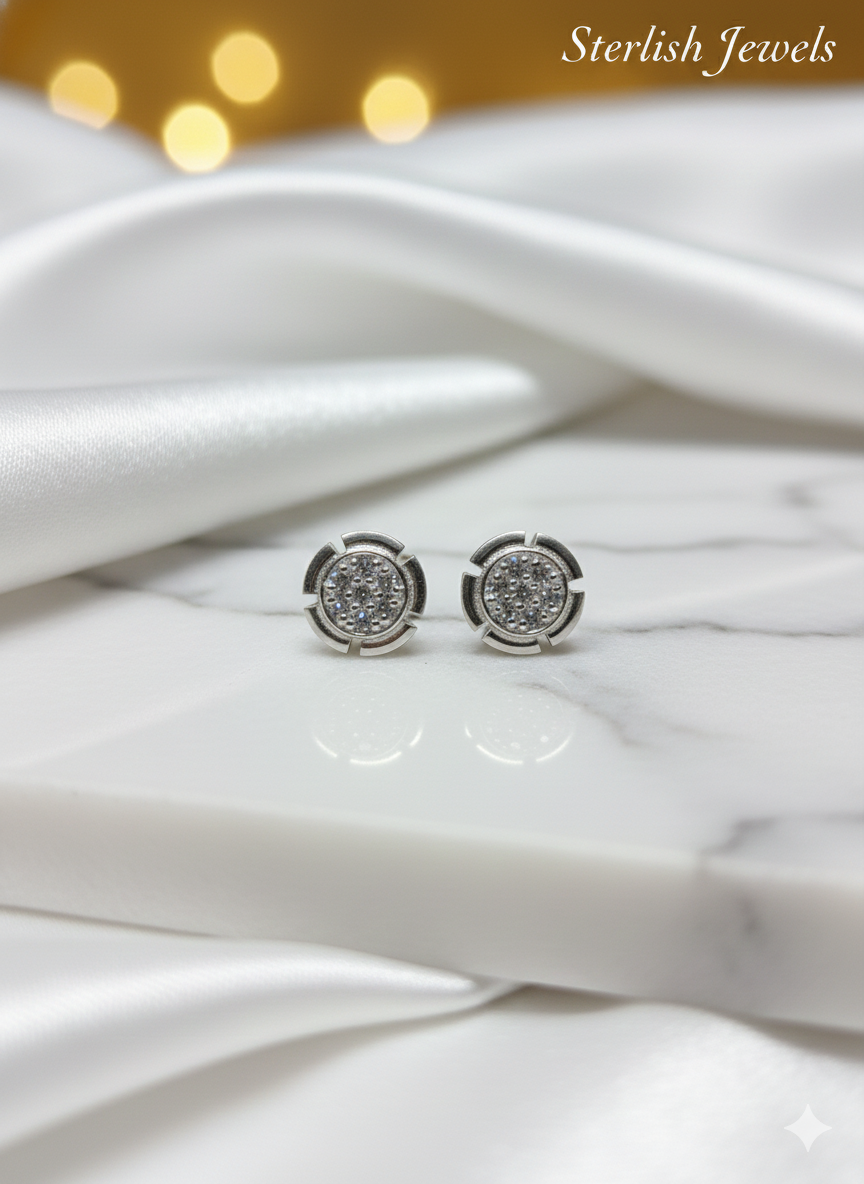 Showcase modern elegance with The Geo Disc Studs. These unique earrings feature a sleek, circular disc design that captures attention. The center of the disc holds a concentrated cluster of micro-pavé stones, providing exceptional, concentrated sparkle. This brilliant center is framed by a bold, highly-polished silver-tone border distinguished by geometric-style cutout accents. The combination of the solid metal structure and the brilliant internal cluster creates a modern, architectural look. These studs are perfect for adding a sophisticated, contemporary edge to both your everyday and evening attire.