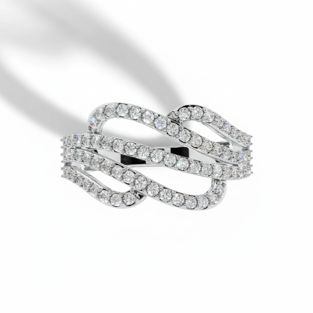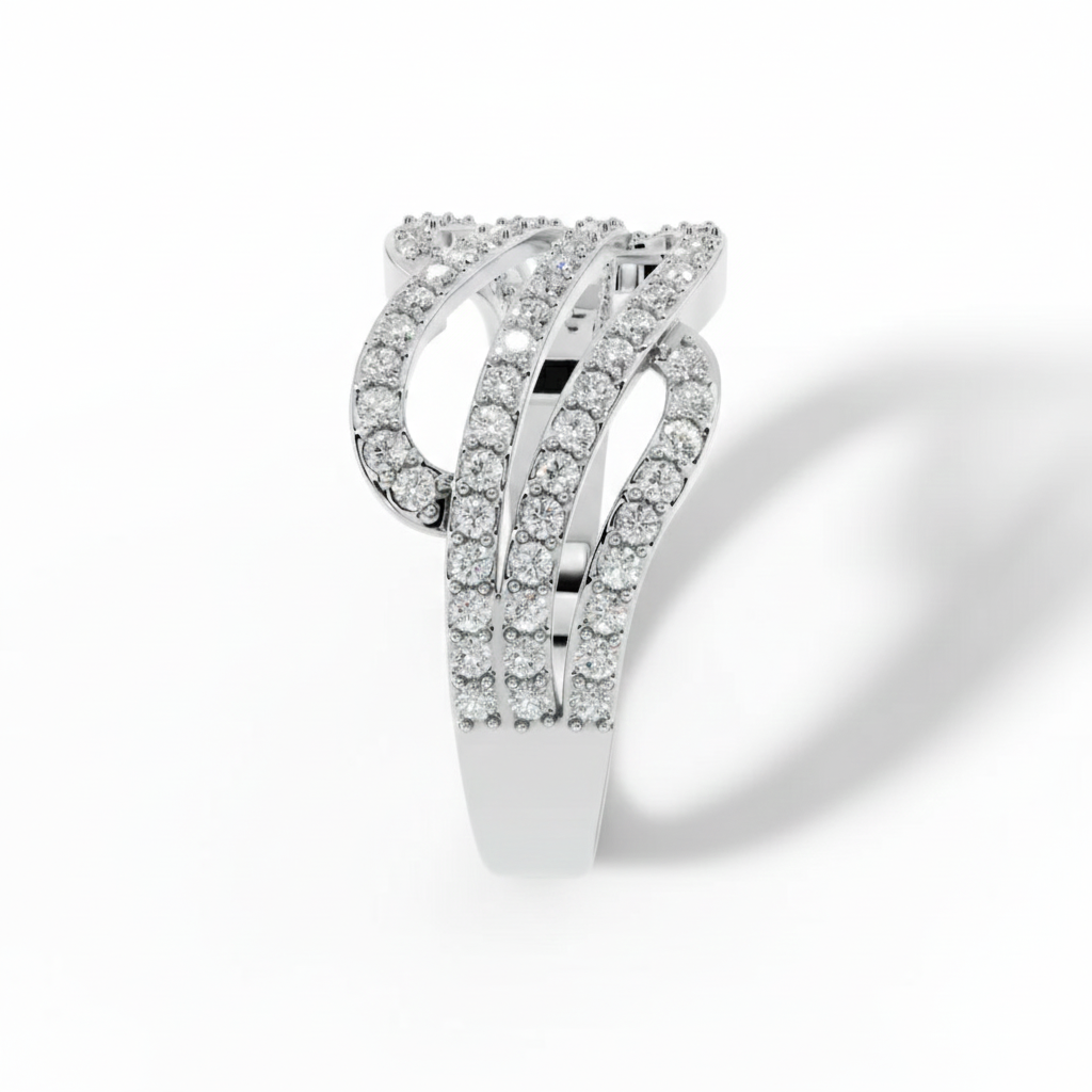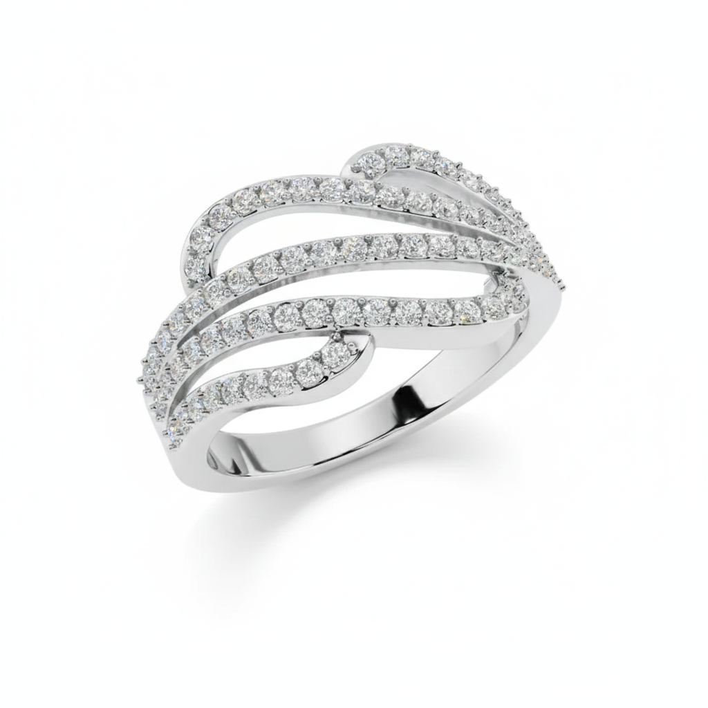 The Triple Wave Ring: Make a bold, unforgettable statement with this spectacular wide band ring from Sterlish Jewel. The design features three distinct rows of finely pave-set clear gemstones that flow and swirl around the finger, giving the luxurious look of a cascading river of diamonds. Crafted in high-polish sterling silver, this three-row pave swirl ring delivers unmatched brilliance and comfort. It’s the perfect wide band anniversary ring or luxury cocktail ring for those who desire maximum glamour and sparkle.